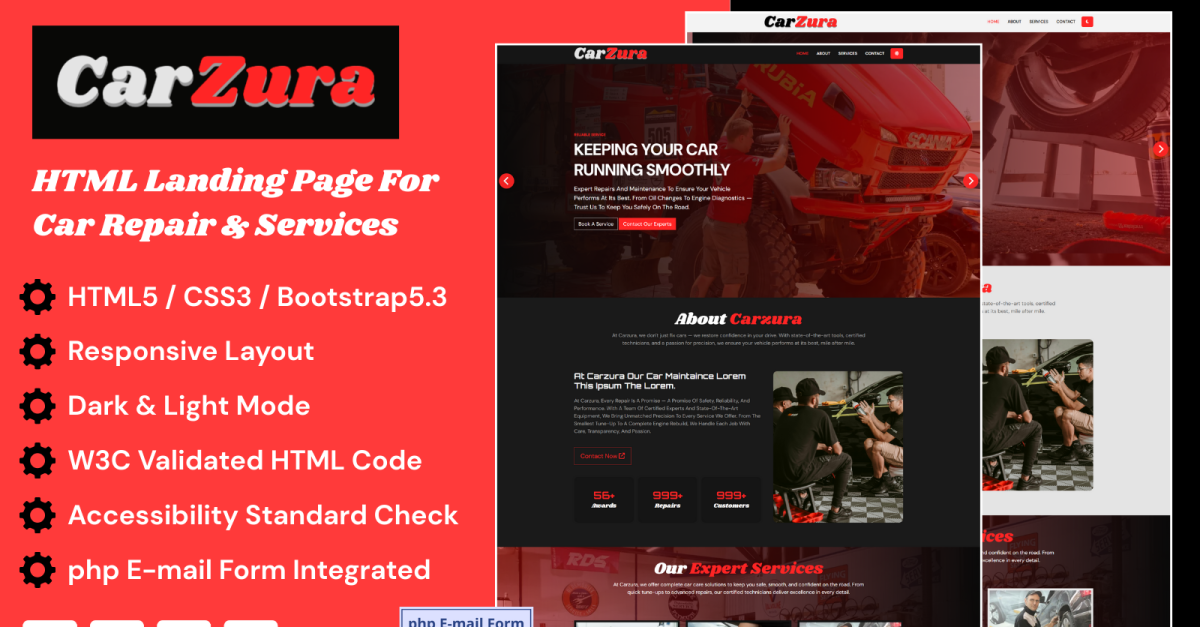 Carzura – Car Repair Workshop One Page Bootstrap Template with Dark Mode