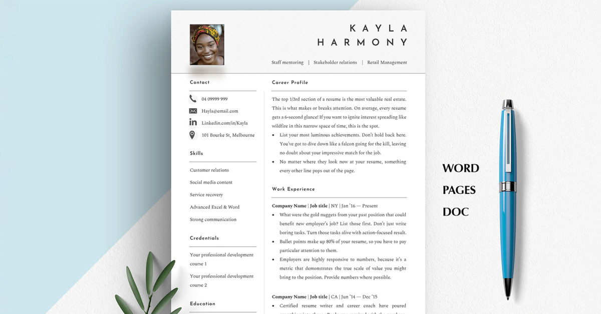 Modern Resume with Photo – Google Docs, Word & Pages | 2-Column Minimalist Cover Letter