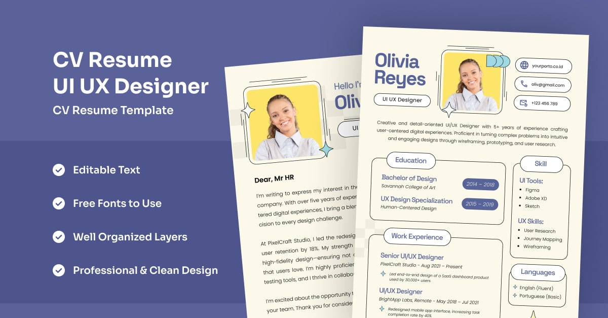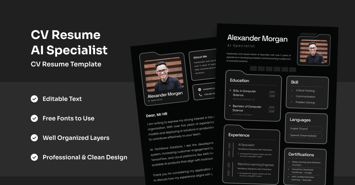 Designed for UI/UX, software developers, and tech analysts, this resume features a smart modular grid and sleek typography for optimal readability. Perfect for startup talents and career switchers looking to stand out. **Highlights:** – A4 format paper size – Free Fonts used – Full Editable files (text, color, & objects are editable) – Compatible with…
